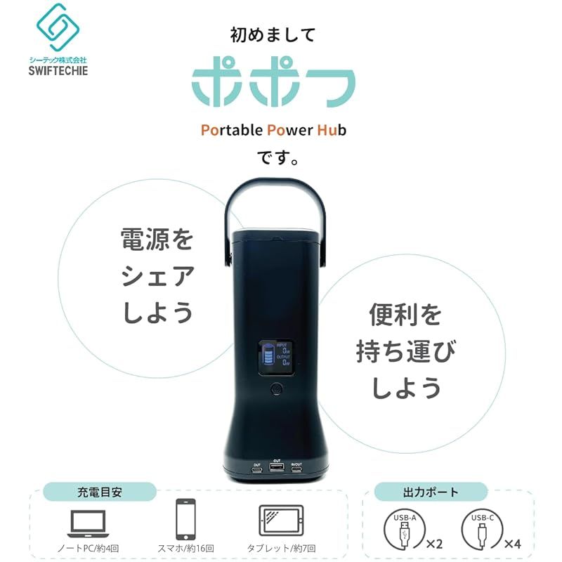 商品名:シーテック スリム ポータブル電源 Portable Power Hub ポポフ (リン酸鉄リチウムイオンバッテリー 192Wh / USB-C×4, USB-A×2 6台同時充電 / ケーブル3本収納 / 急速充電 190W) STPP-200A-B