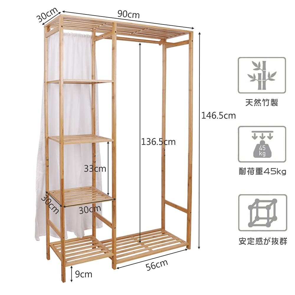 UNHO ハンガーラック クローゼット 竹製 ワードロップ カーテン付き 棚付き コートハンガー 収納 大容量 多目的 洋服ラック 洋服掛け 幅90cmx高さ146