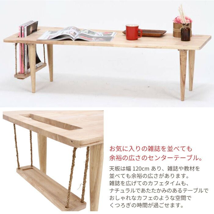サイドにブランコ型マガジンラックが付いた遊び心あふれる天然木製ローテーブル。天然木の質感をそのまま生かした「ナチュラルシグニチャー」シリーズで、自然な色合いと木目がどんなインテリアにも馴染みます。天板は幅120cmと広く、マガジンラック側に向かって少し広がるユニークなデザイン。雑誌や本をマガジンラックに収納しておけば、読みたいときにサッと取り出せて便利です。