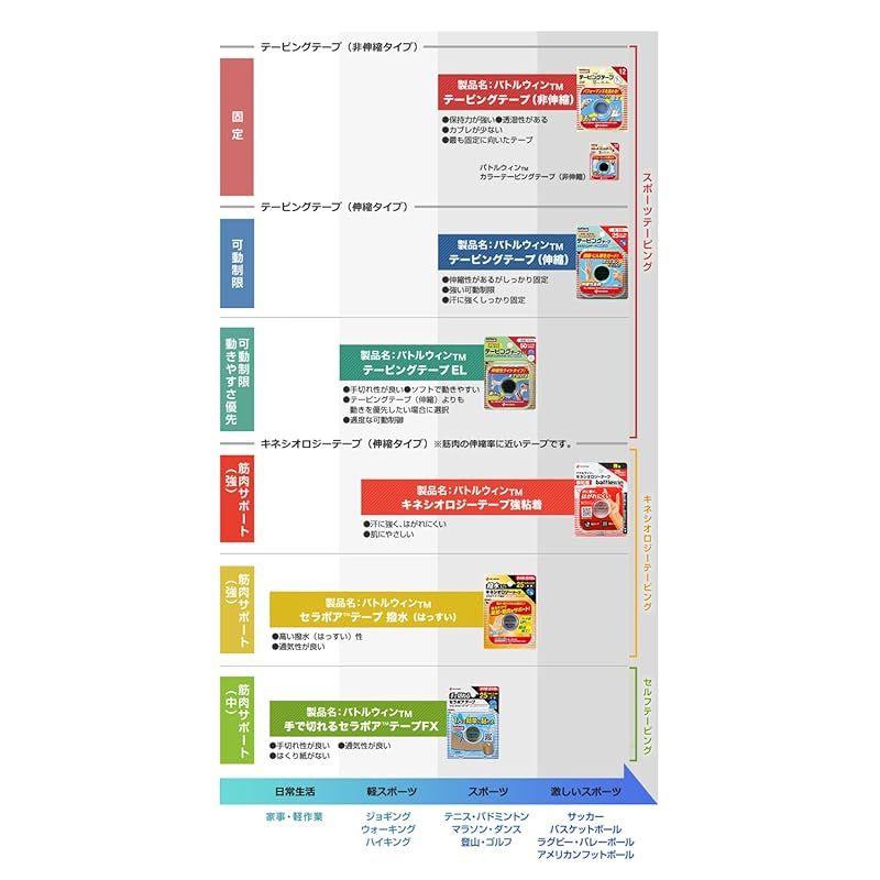 【スポーツテーピングテープ】サッカーやバスケットボール、バレーボールなど、激しいスポーツのケガや傷害の応急処置から予防まで、アスリートをサポート。