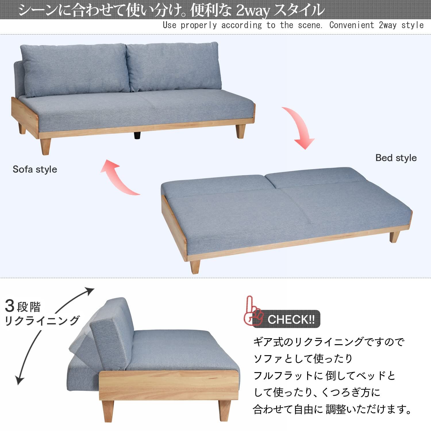 タマリビング Tamaliving ソファベッド リモーネ グレー 幅184.5 cm 3人掛け セパレート式リクライニング 木製フレーム ソファ ソファー ソファーベッド ベッド