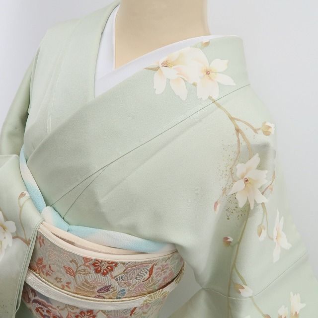 裏葉柳色の地に大輪の牡丹が咲き誇るこちらのお着物は、爽やかな地色に淡い花の色合い、そして青々とした葉のコントラストが調和し、自然の景色をそのまま写し取ったかのような美しさ。筆で一つひとつ丁寧に染め上げる手描き友禅ならではの繊細な筆致が際立ちます。
