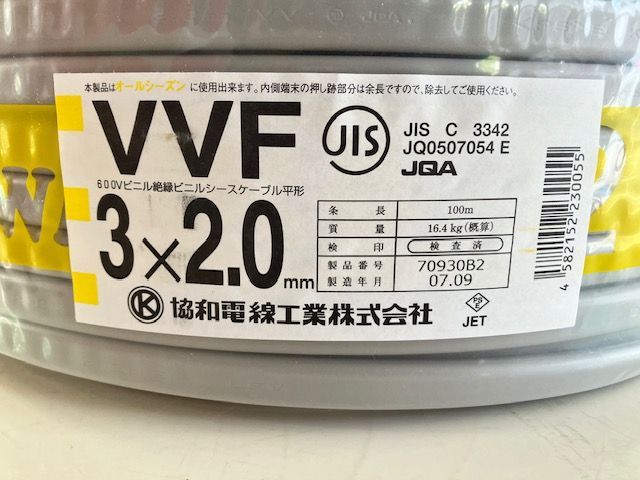 【品名】協和電線◆VVFケーブル 3×2.0mm 100M 赤白黒 【未使用】令和7年9月製造