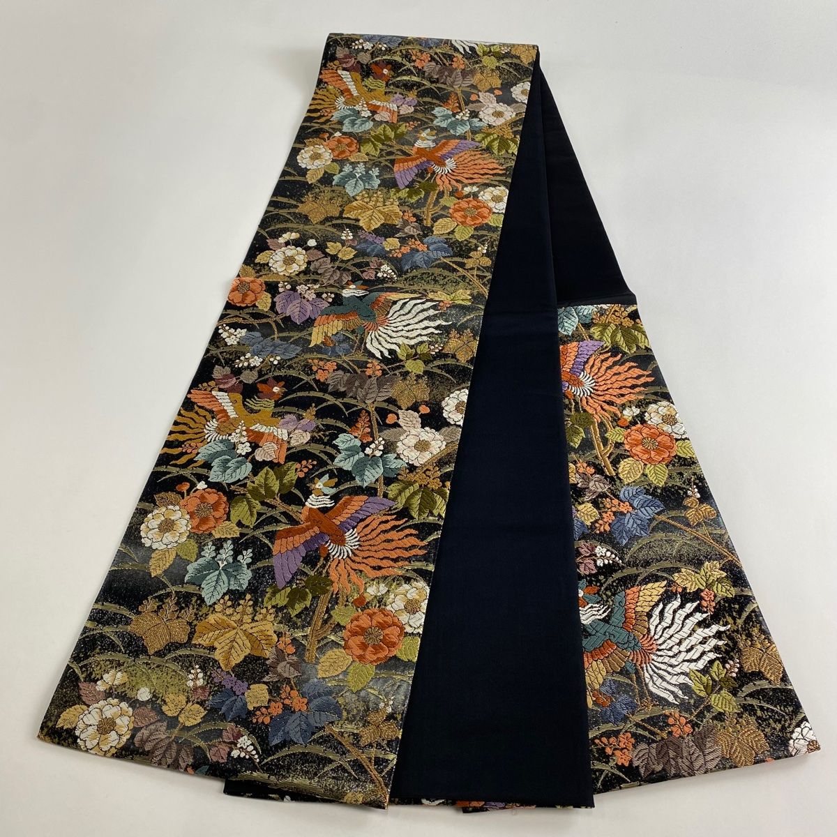 袋帯 桐鳳凰紋 草花 純金箔 唐織 黒 六通 正絹