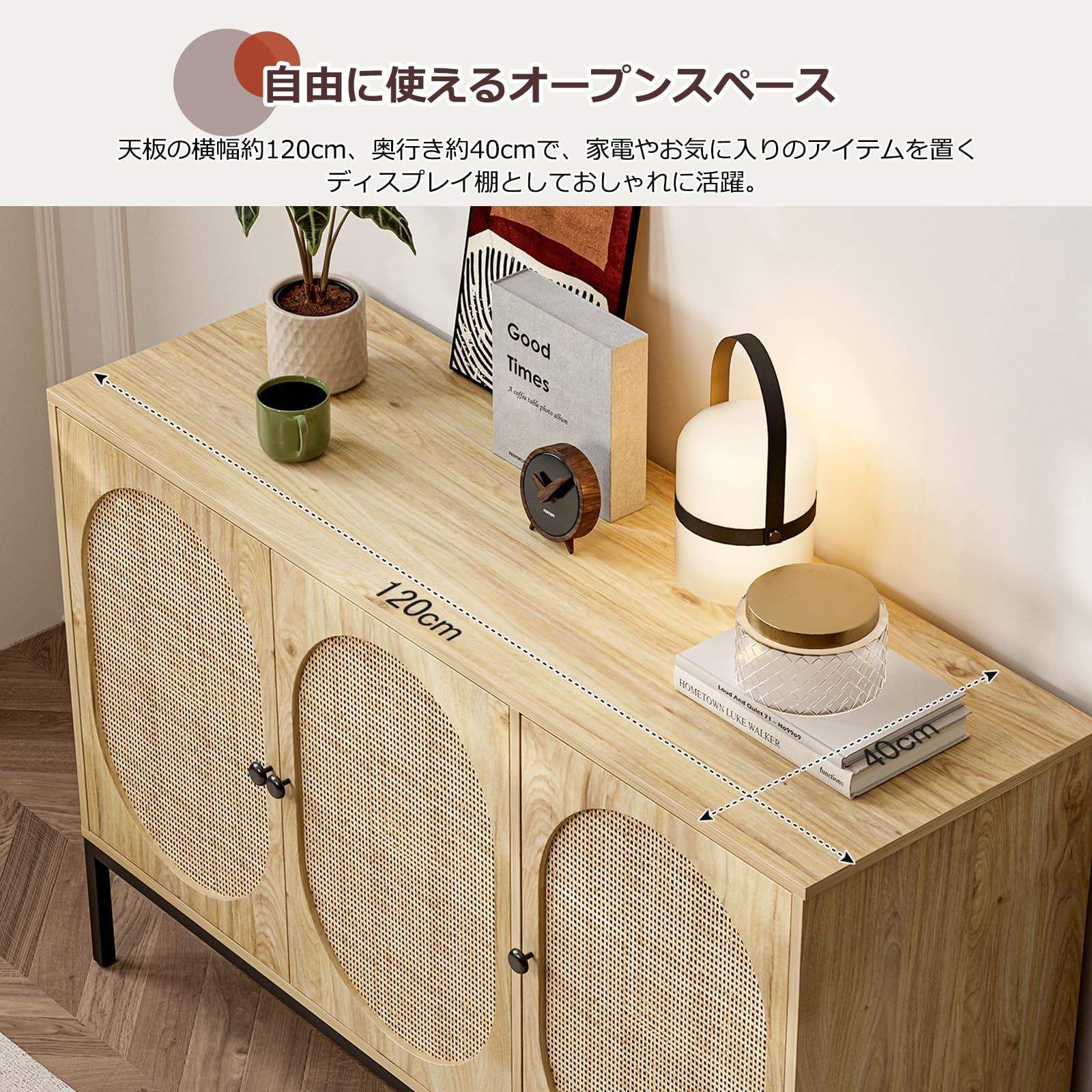 【天然素材ラタンおしゃれなキャビネット】サイドボードは天然ラタンと手織り技術で作られて、一面が木材の家具に比べて圧迫感や重さが少なく、爽やかな風が通るような抜け感を感じていただけます。 天然ラタン、リアルな木目調とマットな質感のスチール脚の完璧な組み合わせで、完璧な視覚効果とご自宅にユニークな魅力を加えます。 家具としてはもちろん、インテリアとしてもお使いいただけます。寝室の収納キャビネットとしてだけでなく、キッチン食器、廊下や玄関のビュッフェキャビネット、オフィスのロッカーとしても大活躍する。