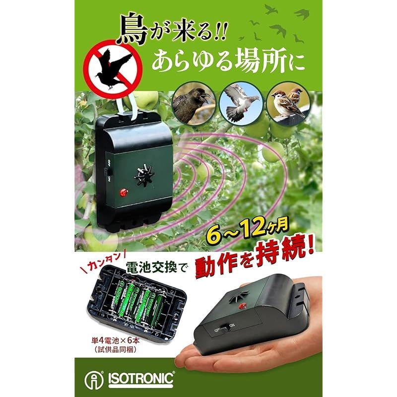 商品名:ISOTRONIC 2個入 カラスよけ 鳩よけ 鳥よけ 防水 超音波撃退器 電池式でベランダなどどこでも設置 吊るせる 有効範囲40m2 70628