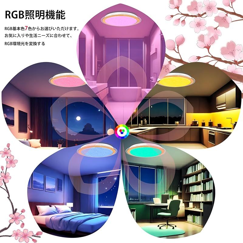 【RGBムード照明】シーリングライト搭載機能:RGBカラーはお好みに合わせて変化し、音楽に合わせてライト効果も変化し、生活に様々な彩りを添えます。 ・静的なアートモード:モネ《睡蓮》の藍紫 ~ ゴッホ《ひまわり》の金黄まで; ・音楽連動モード:再生楽曲に連動,リビングが瞬時に煌びやかなカラオケスタジオに変貌。