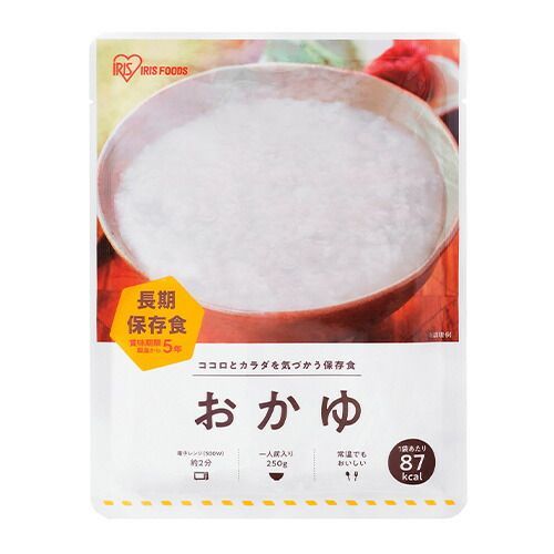 ●仕様:おかゆ●1袋容量:250g(1人前)●エネルギー(1袋あたり):約87kcal●賞味期限:製造日より5年