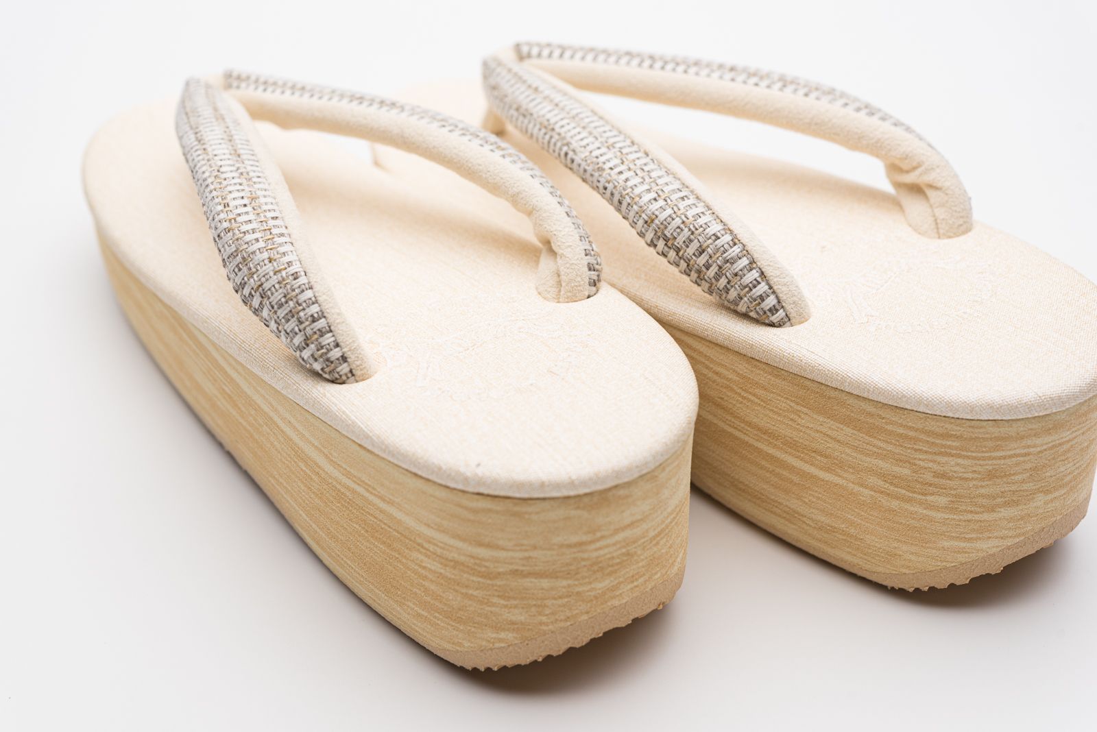 浅いベージュの台に変わり横段織りの鼻緒を合わせたカフェ草履です。