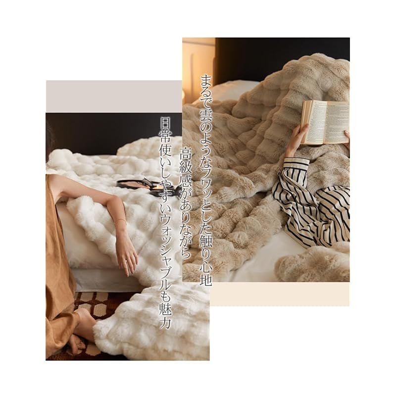 【高品質な素材&二枚合わせ毛布】 VERILADYの毛布はラビットファー風の二枚合わせ仕様で、両面がふわふわな素材。高級感があり、保温性も抜群です。おしゃれなお部屋のアクセントにもなり、寒い冬でも暖かく過ごせるブランケットです。ふんわり柔らかくしっとりとした肌触りで、心も体も温まります。耐久性に優れた生地で、ふわふわな触り心地を長くお楽しみいただけます。