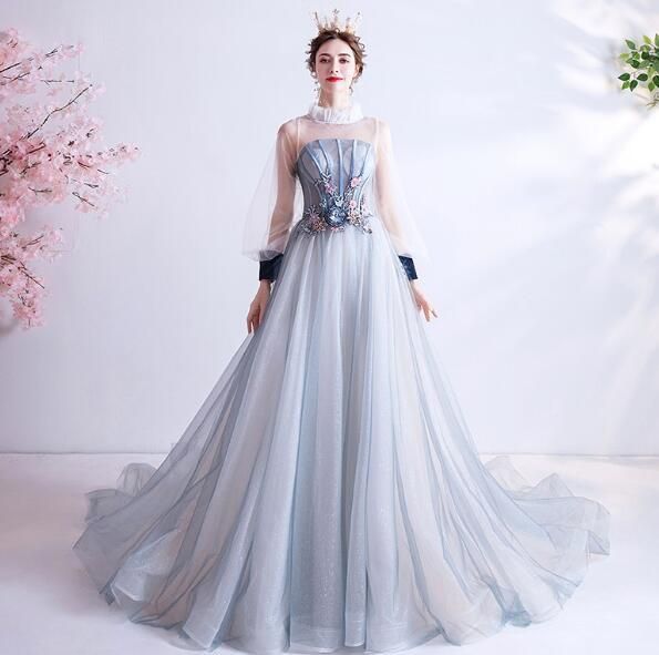 豪華なチュールロング丈パ-ティ-ドレス。サテン地の上にチュールをかぶせたエレガントなデザインです。袖はチュ-ル仕様になっていて透け感がエレガントです。胸元は立体刺繍が施されエレガントで大人の魅力をアップ。後ろの裾が長い引きずるデザインです。前撮り撮影やパーティやイベント、結婚式など、様々なシーンで、気品のある印象を与えてくれる一枚です。背中網掛けですので紐の結び具合により多少サイズ調整も可能です。背中結び紐有り。胸パット付。裏地有。