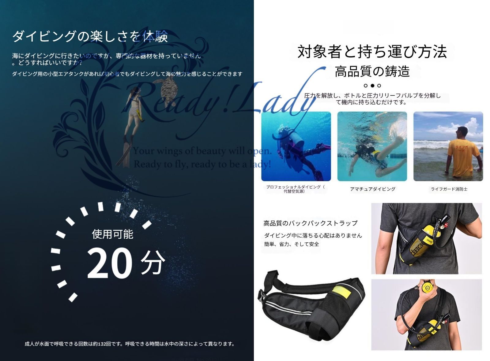 【高品質耐食性&耐圧性】この製品は高精度の製品です。航空6061アルミニウム合金を採用し、内部腐食を防止します。操作は簡単です。ダイビングも簡単です。大きなダイビング器を持ち歩く必要はありません。地震や津波からの脱出、緊急救援設備になることができます。