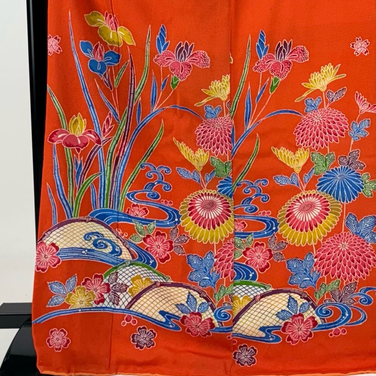 振袖 身丈170 cm 裄丈70 L 袷 菖蒲 流水 縮緬 オレンジ 正絹 秀品
