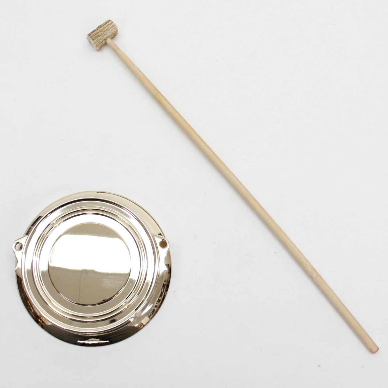 4寸5分(4,5号)のスリ鉦は、お子様や比較的手の小さめの方がお使いになるサイズでございます。鹿の角を加工したばちは柄の部分が丸くなっております。