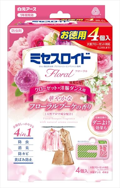 洗いたてのようなやさしい香りのする防虫剤。4つの機能※で衣類を守ります。収納空間のダニよけ効果付き。大型クローゼット対応(3200Lまで)、または洋服ダンス4本分。1年間有効。フローラルブーケの香り。※防虫・消臭・防カビ・黄ばみ防止