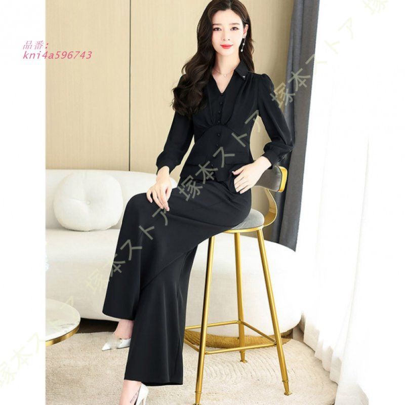 レディース パンツスーツ セットアップ 上下セット ブラウス ワイドパンツ ファッション エレ気質 Vネック 長袖 カジュアル 着痩せ 大きいサイズ kni 4 a 596743