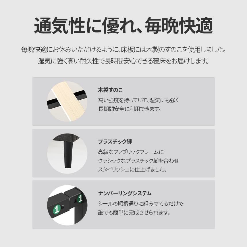 ◆ヘッドボード付きの柔らかな風合いの布張りフレーム◆強力な支持力の木材スラット(すのこ)◆ヘッドボードの中に組み立てに必要な工具が付属していますので、別途工具を買う必要はありません。◆防音テープをすのことフレームが接する面に貼付け、より良い睡眠環境づくりができます。聞こえるのは目覚ましだけです。※フレームのみ、マットレスは付いておりません。寸法:ベッドフレームのみ:195x97x31cm、ヘッドボードを含む場合:196.5x103x89cm