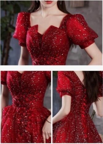 パフスリーブチュールのプリンセスドレスです。金と銀のラメをあしらった赤色のサテン地に同色のチュールを重ね全体的にフェミニンでエレガントな雰囲気に。幅広ウエストで全体をきゅっと引き締め、下半身はチュールをたっぷりと使用しゴージャスな印象に。背中はヒップまで編み紐掛け仕様ですので、紐の締め具合でバスト、ウエストのサイズ調整が可能です。パーティやイベント、結婚式など、様々なシーンで、気品のある印象を与えてくれる一枚です。裏地なし(下地のサテン地が裏地になります)。背中編み紐掛け。ファスナーなし。胸パット付。