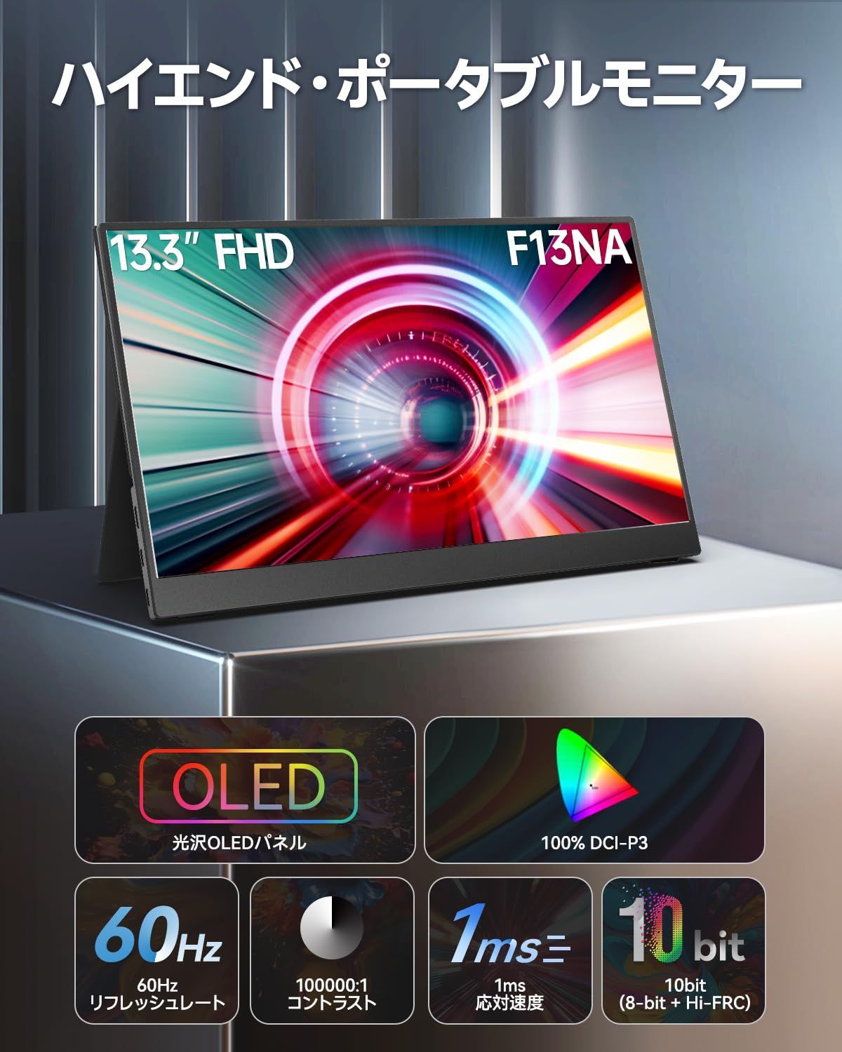 数量 モニター Switch ミニHDMIポート搭載 Type-C USB ゲーミングモニター HDR対応 100000 1高輝度 F 13 NA DCI-P 3 10 Bit 1080 P OLEDパネル自発光 有機el 13.3インチ モバ