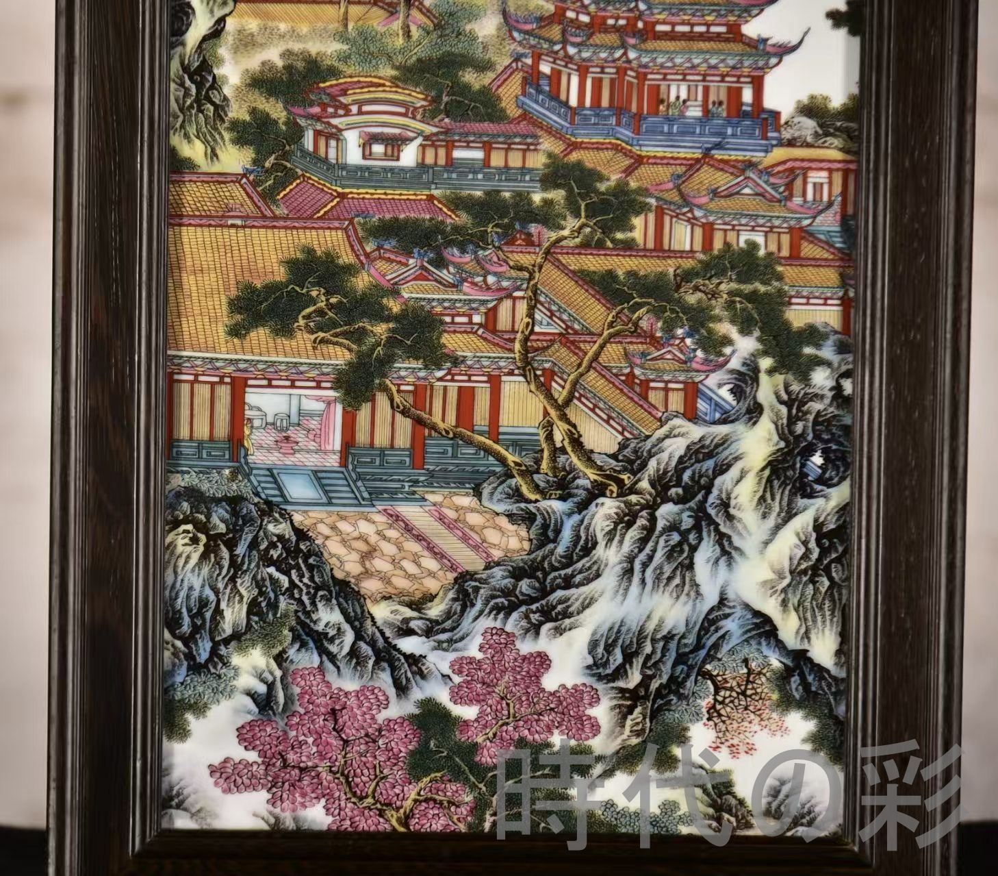 中国古美術 汪野亭作 粉彩山水図 鶏翅木枠磁板画 亭台楼閣 彫花框 木彫り額縁 手描き磁器絵画 掛軸風 景徳鎮 書斎 茶室