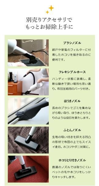 付属品 ロングノズル、フロアノズル、隙間ノズル、隙間ノズルホルダー、スタンド、充電用ACアダプター、バッテリーパック( 本体に装着済み )、取扱説明書( 保証書含む )