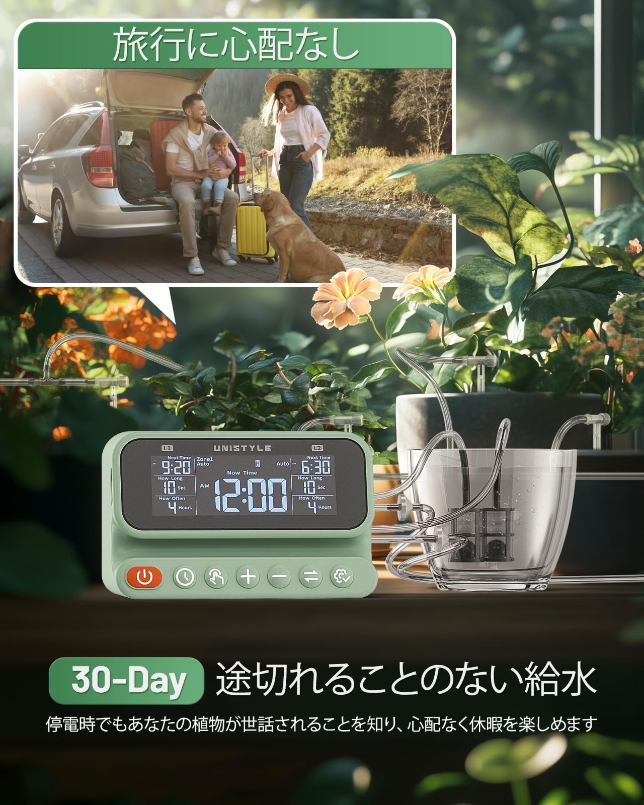 「2026 年新モデル」植物自動散水機 自動水やり機 鉢植え用自動散水ドリップ システム、Unistyle 屋内植物用給水装置、2 ゾーン自動植物給水器、30鉢対応可能、散水スマートタイマー セット10mホース付き、滴灌漑システム、防水LEDディスプレイと大容量バッテリー、正確な配水 植物 留守 ガーデン花植木鉢自動給水器 (グリーン)
