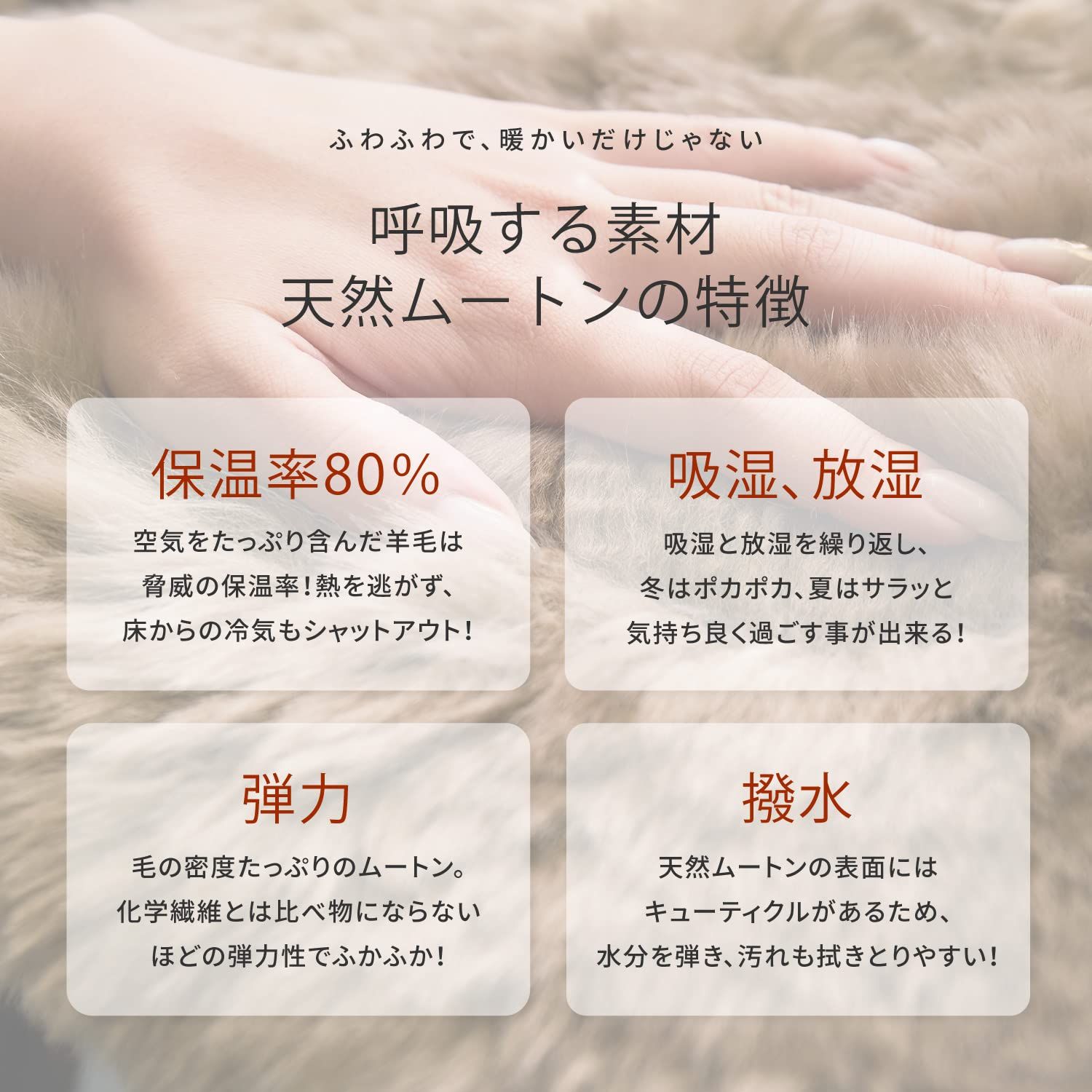 ムートンは、吸放湿性に優れているので、表面は常にサラッとしています。汗が出てもべたつきにくく一年中快適にお使いいただけます。また、火にも強く燃え広がりにくく、表面は水を弾く性質もあります。自然の効力をもった人にやさしい万能素材です。