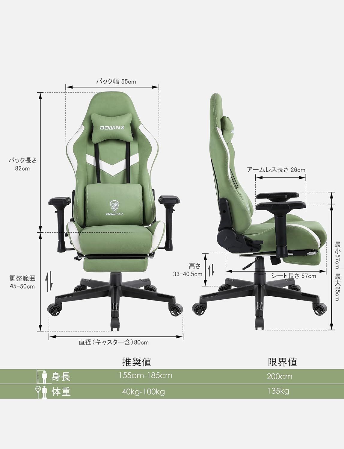 Dowinx ゲーミングチェア ファブリック オットマン付き オフィスチェア パソコンチェア リクライニング 4 Dアームレスト デスクチェア ゲーム用チェア フットレスト ヘッドレスト ランバーサポート ポケットコイル グリーン LS-66684 D-06
