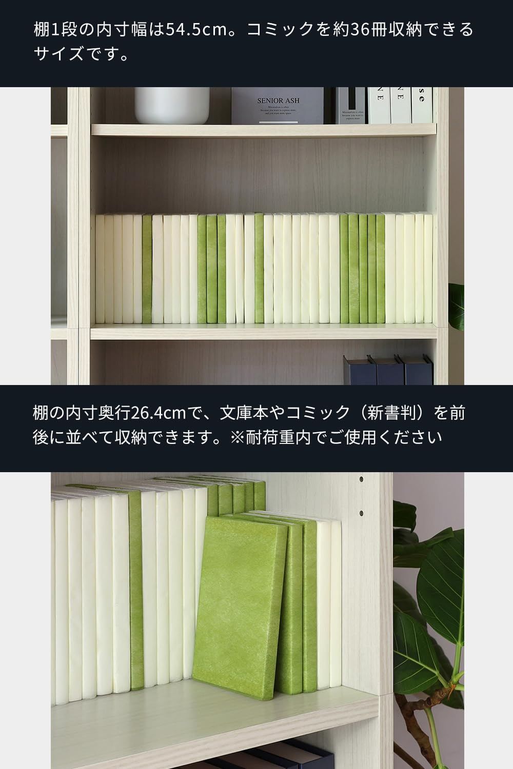 小さな文庫本なら前後に並べて置くことができます(棚板耐荷重は7㎏)。