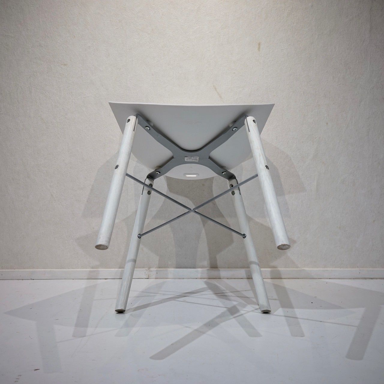 湾曲した一体成型のシェルと、構造美を引き立てる木製脚の組み合わせが印象的な一脚。