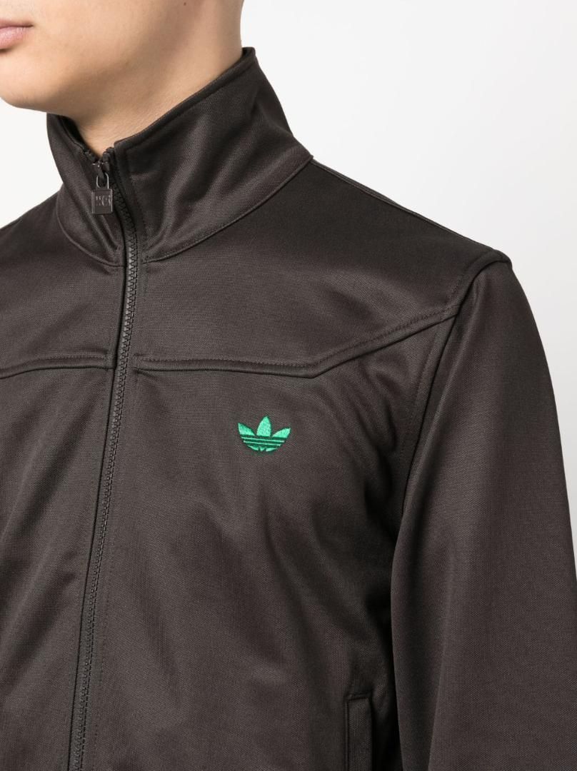 コーヒーブラウン、リサイクルポリエステルブレンド、トレフォイルロゴ、バックにエンブロイダリーロゴ、ハイネック、フロントにジップ式開閉、ロングスリーブ、サイドにセットインポケット x 2。