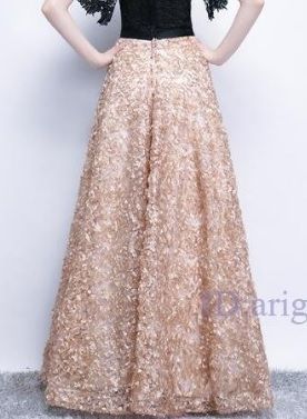 トップスレ-ス仕立ロングドレスです。トップスは黒のレ-ス仕立て。スカート部分はゴールドの花レース風。女性らしさとエレガントさを同時に演出した一品です。胸パット入り。ウエスト黒サテンリボン付き。背中ファスナー有。裏地付。胸パット付。