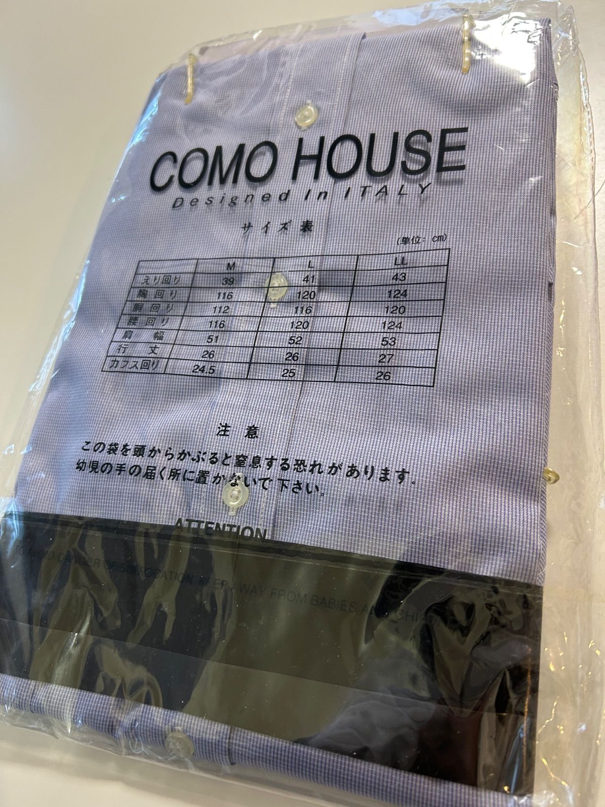 未使用品COMO HOUSEメンズ半袖ワイシャツ青色ブルー系襟回り41-裄丈ゆき丈26 ドレスシャツ ビジネスシャツ袋入 形態安定表記サイズL