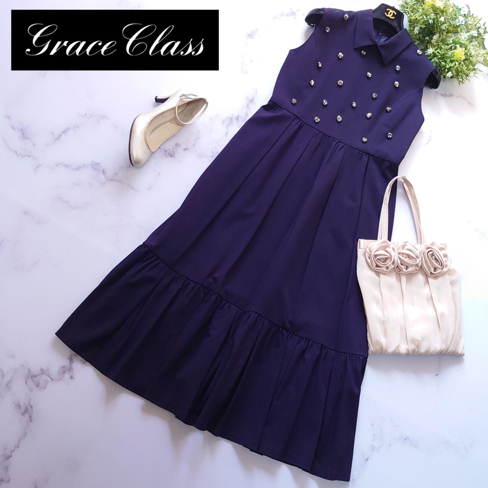 2020 グレースクラス ビジューティアードドレス ロング 紺 フ 36
