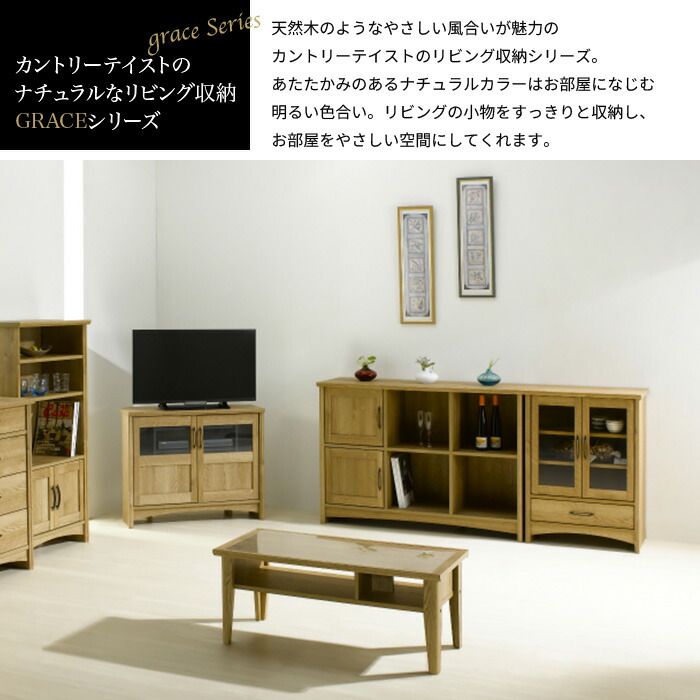 天然木のような優しい風合いのカントリー調デザイン家具。洋室・和室どちらにも馴染むナチュラルテイストです。扉付き収納で小物やソフト類をすっきり隠せ、見た目もスマート。各収納部はA4ファイル対応で書類整理にも便利。リビングやダイニング、子供部屋まで幅広く活躍します。