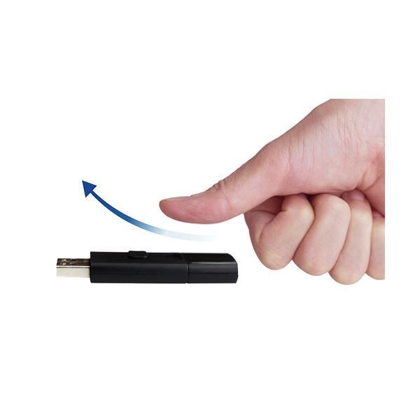 ●片手で簡単操作可能な、スライド式USBメモリーの128GB。カラーはブラックです。