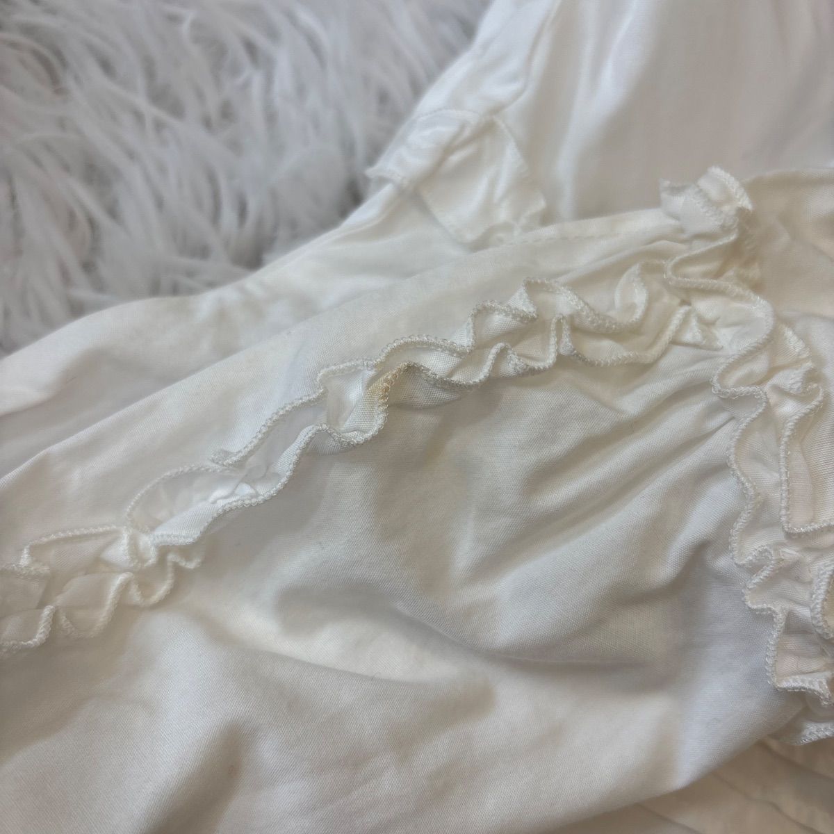 上から4つ目のボタンの右側に1ミリ程度の点汚れ、右肩付近のフリルに変色。