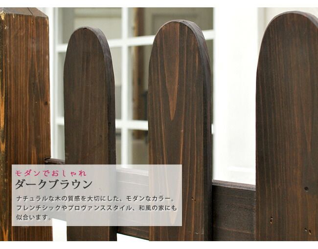 【ピケットフェンス】毎日お庭に出るのが楽しくなりそう♪フレンチカントリーやプロバンス風のお庭にするなら、ピケットフェンスが絶対おすすめ!欧米のお庭でよく見られるピケットフェンスは、全体の雰囲気をまるまるオシャレに変えちゃいます。ホワイトなら緑や空の青に映えるし、ダークブラウンならモダンな雰囲気。機能的にも優秀で、適度なすき間があるデザインは圧迫感がなく、風通しも良く、道路からの目隠しとしても最適です。 ピケットフェンスがあるだけで、植物が可愛らしく見えますよね。 ■商品名ピケットフェンス ストレート4連結セット(土中用) ・フェンス…4枚 ・ポール…5本・土中用金具…5個 ■カラー・型番 ダークブラウン…SFPS1200-4UB-DBR ホワイト…SFPS1200-4UB-WHT ■サイズ フェンス:幅 約1202×奥行 約25×高さ 約872mmポール:幅 約74×奥行 約74×高さ 約950mm土中用金具:幅 約140×奥行 約140×高さ 約460mm ■重量 フェンス:約 3.4kgポール:約 1.0kg土中用金具:約 1.6kg ■材質 天然木 ■仕上げ ステイン塗装 ■組立区分 完成品 ※設置には作業が必要です。 ■備考 ステイン塗装によるホワイト色は、木目や地目が見えるウォッシュホワイト仕上げとなります。画像で判断しにくい部分がございますが、ご注意ください。