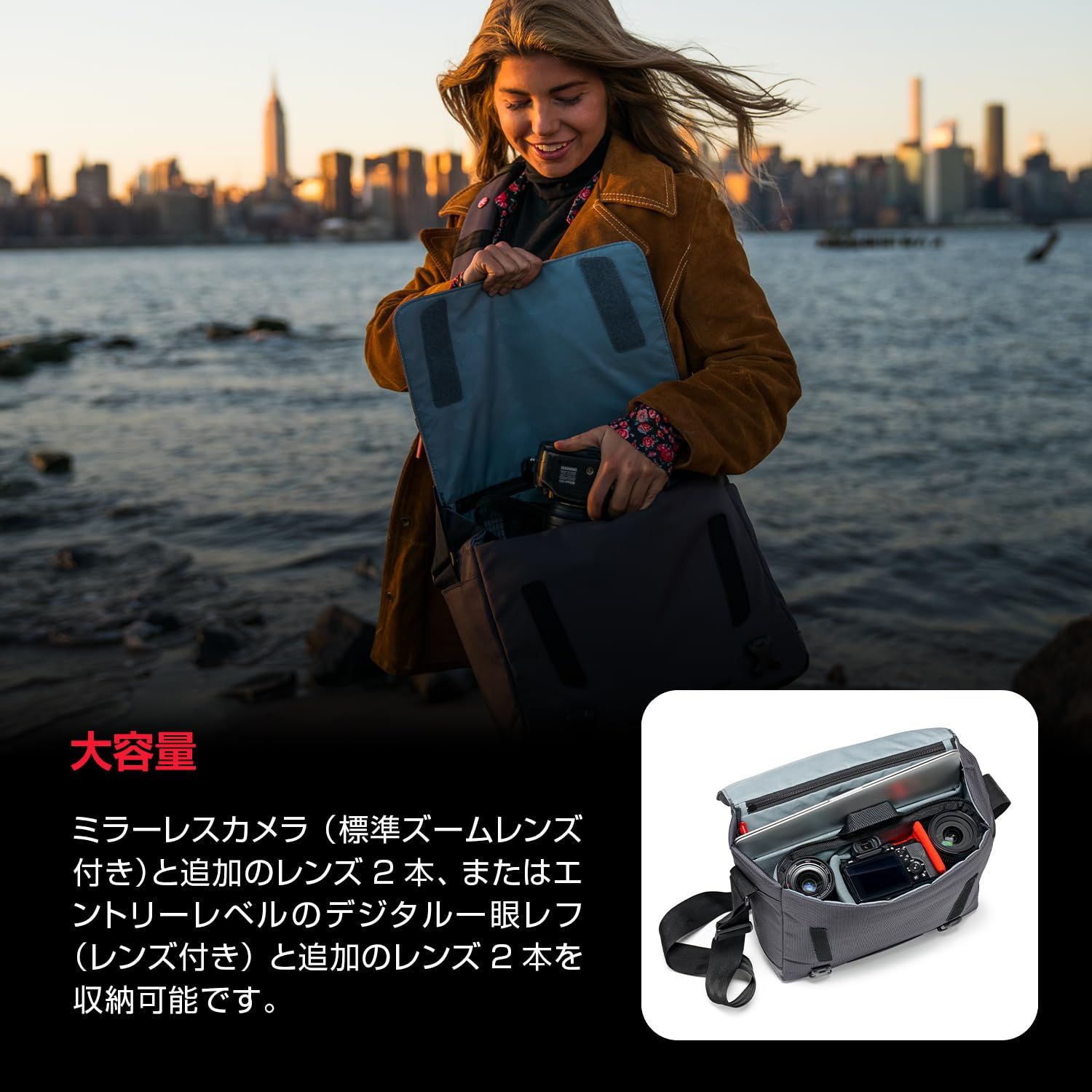 ■移動に適したカメラバッグManhattanコレクションは、撥水加工が施されており、クッション性の仕切りがある収納ケース、PC収納スペース、アクセサリーポケット有の優秀なメッセンジャーバッグです。