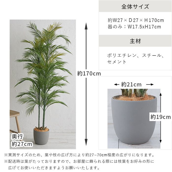 アレカヤシリアルなのにお手入れ不要!光触媒加工で空気をきれいに置くだけおしゃれなフェイクグリーンサイズ 約W27×D27×H170cm 器のみ:21x19cm材質 ポリエチレン、スチール、セメント生産国 中国梱包 ダンボール箱梱包サイズ 240ご注意※ご覧のモニターの環境、撮影環境により実物と色味が異なって見える場合が御座います。※酸化チタンx銀xヒノキチオールによる光触媒加工を施しています。※本商品は植物ではありません。水やり不要です。※サイズ、形状、色の濃淡が個々に異なる場合があります。※梱包には細心の注意を払っておりますが、万一不自然な形になっている場合には手直しをお願いいたします。※茎や花の茎先にスチールピックが付いていることがあります。怪我をしないようお取り扱いにはご注意ください。※品質管理に万全を期しておりますが、まれに配送時の動きにより花や葉が落ちてしまうことがあります。繊細な商品のためどうしても避けられません。 取れてしまった場合は市販のボンド・アロンアルファー・グルーガン等で接着が可能です。※直射日光・火気・暖房器具の熱の当たる場所はお避け下さい。色あせ等商品劣化の原因となりますのでおすすめできません。※ホコリによる汚れは、柔らかい布やハタキなどで取り除いて下さい。色あせ、型くずれ、サビの原因になりますので、水洗いはおすすめできません。※お客様都合によるご返品、ご交換は出来かねますのでご了承くださいませ。