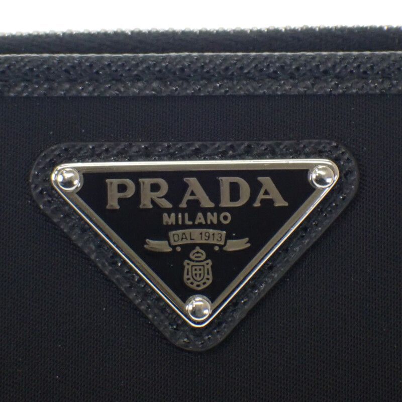 ブランドを象徴する再生ナイロン素材“Re-Nylon”とサフィアーノレザーを組み合わせた、モダンでサステナブルなデザインが魅力。ブラックにシルバー金具、そしてトライアングルロゴが映える洗練されたルックス。コンパクトながらカードスロットや紙幣入れなど収納力も十分で、ユニセックスで愛用できる一品です。