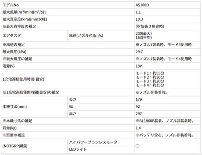 ・エアダスタ-風速(ノズル付)(m/s):200(最大)/163(平均)※ノズル7装着時、モード4使用時