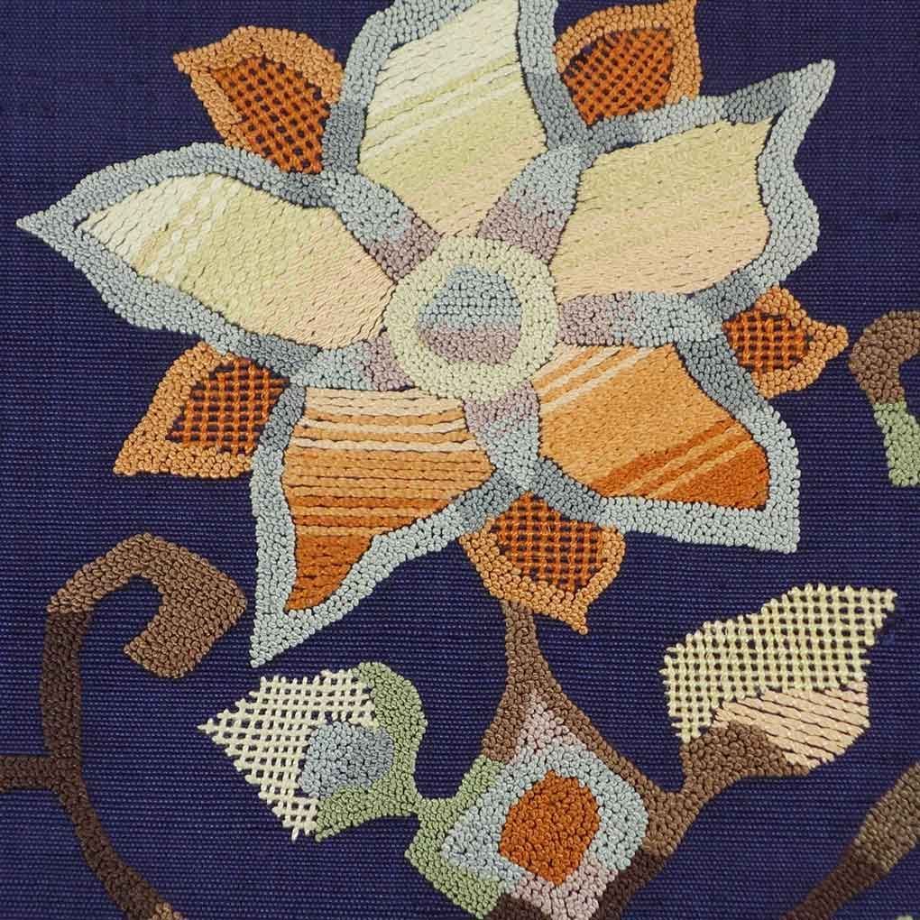 正絹の八寸名古屋帯です。紫地の紬生地に花柄の相良刺繍で紬や小紋などカジュアル用途の着物に合わせてお使いいただけます。八寸帯は手先の短い松葉仕立てが多いですが、これは手先の長い名古屋仕立てになっております。