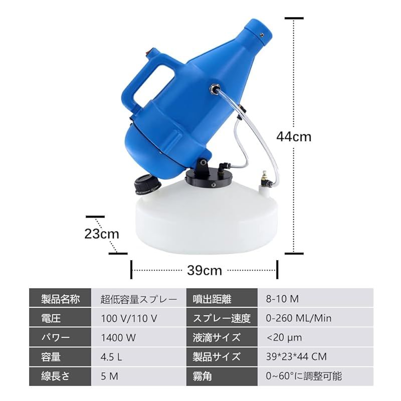 商品名:BriSunshine 噴霧器 電動 ミスト 噴霧器 タンク4.5L 射程距離8-10m 角度/流量 調節可能直射 100/110V 霧吹き 電動 ハイパワー 1400W 自動噴霧器 除草 電動ふんむき 薬剤/肥料/農薬散布機 園芸/家庭用 病院/事務所/学校