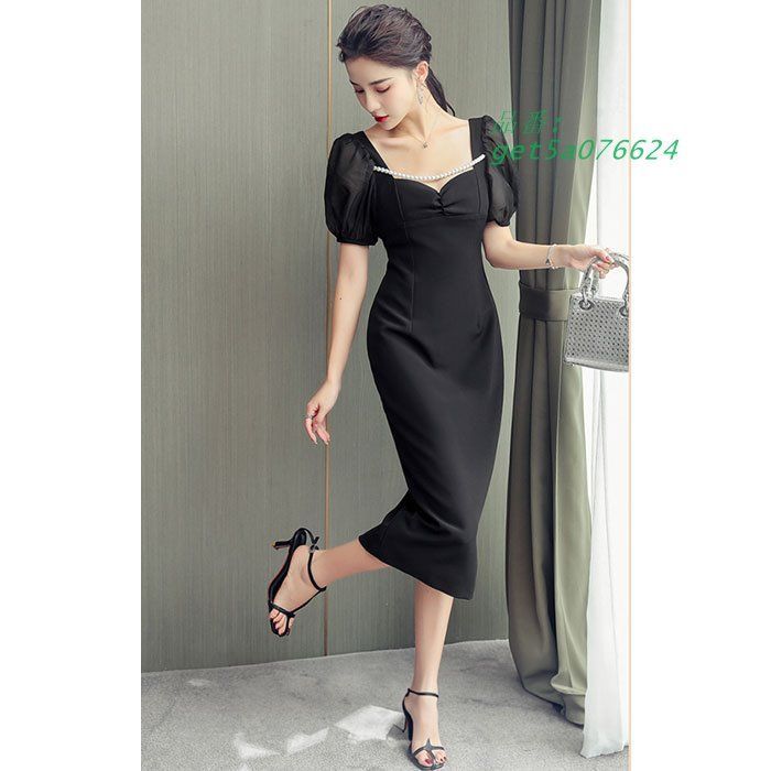 パフスリーブ半袖 パールビジュー膝丈タイトドレスワンピース 黒 結婚式 お呼ばれ パーティー レディース 服 韓国 get 5 a 076624