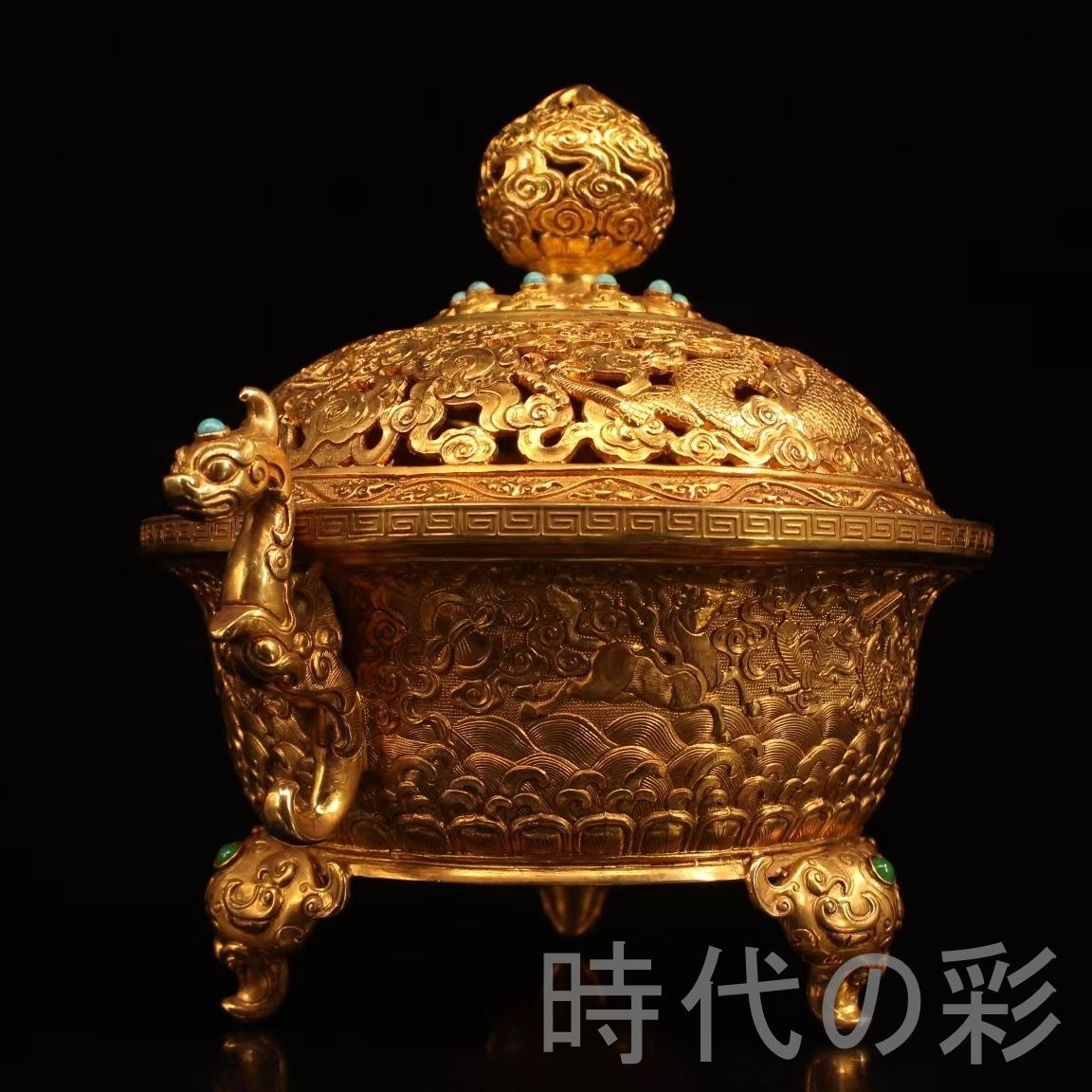 本品は純銅製の高浮彫描金八宝熏香炉で、精緻な工芸と透かしが特徴です。鑑賞や収蔵、装飾に適しています。