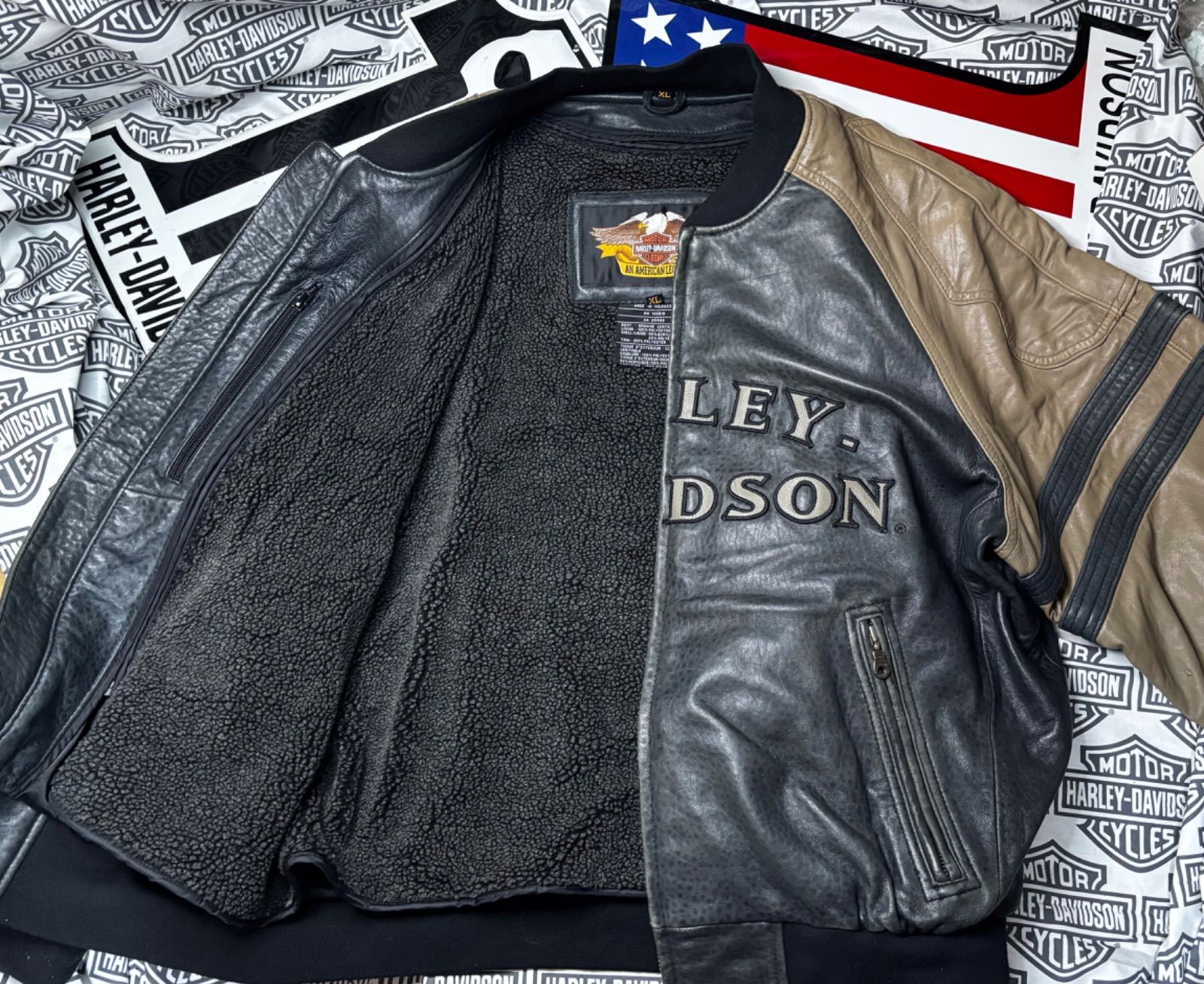 ⭐️非常に稀少なレアモデル稀少な前後本革H-Dロゴ刺繍⭐️非常にレアでかなり稀少モデル!入手困難・前面&背面H-D大型稀少ロゴ刺繍・モデル!⭐️Harley-Davidson ライダースジャケット レザージャケット しなやかで柔らかく高品質ラム本革製ソフトグレイン・レザー⭐️ブラック&ライトブラウンのツートーン・カラー⭐️脱着可能なオールシーズン対応・インナーの防寒用ボア・ライナーで冬は防寒性&夏は取り外し可能⭐️稀少モデル※前面・背面H-Dロゴ刺繍のレアなモデル・リミテッドエディション※非常に柔らかく厚手のソフト高級純正ラムスキン本革製・艶・軽くて丈夫で着てても楽な作り⭐️メインメタルZIP・インナー胸ZIPポケットX2・表部メインZIPポケット左右2有り⭐️高品質のHDC GENUINE LEATHER高級なラムスキン本革を使用したライダースジャケット、クールなかなり稀少なモデルです!イーグルタグ・AN AMERICAN LEGEND タグ⭐️