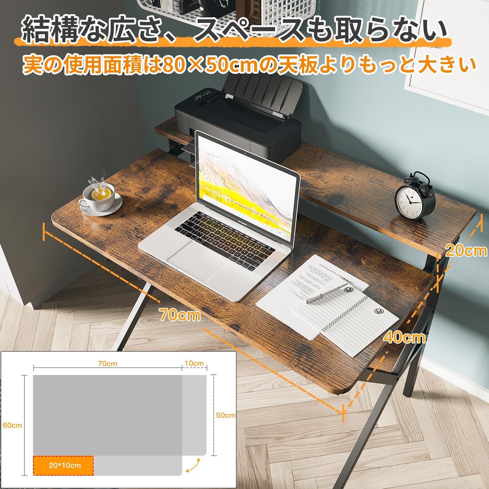 ビンテージ モニターアーム対応 組立簡単 一人暮らし 省スペース テレワークデスク 棚付き desk computer 小さい 勉強机 ゲーミングデスク 幅70 cm×奥行60 cm モニター台付き コンパクト パソコンデスク pcデスク 机 KKL