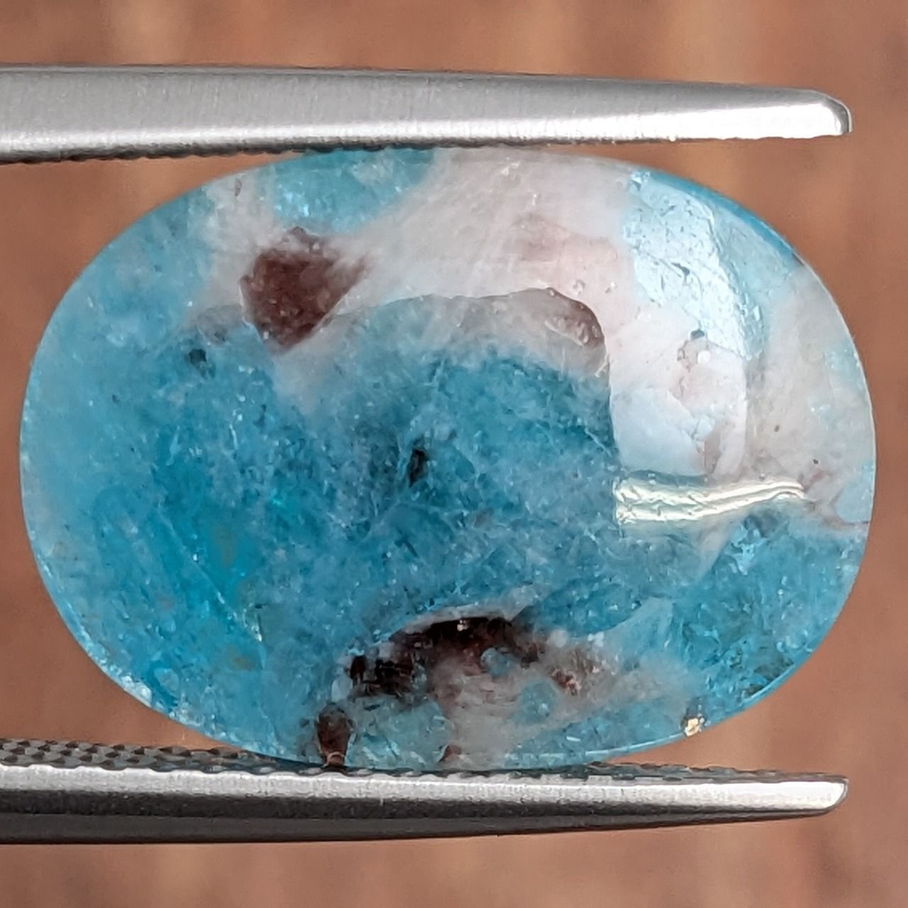 「パライバ・イン・クォーツ」となっていますが、比率的にはほぼ「クォーツ・イン・パライバ」と呼びたい1ピース。一見黒いインクルージョンに見える部分は、ちょっと暗めのレディッシュ・ブラウンの結晶インクルージョンです。このタイプのお石は、是非模様も合わせてお楽しみください。