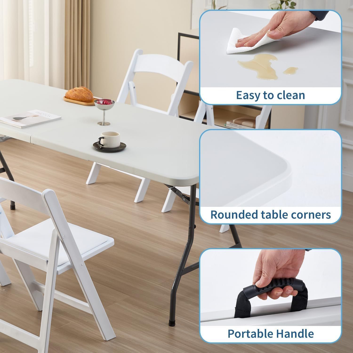 折りたたみ便捷:この6フィートの折りたたみテーブルは簡単に折りたたんでロックでき、コンパクトに収納できます。便利な手提げハンドルが付いており、持ち運びが楽々。折り畳みテーブルは車のトランクにも簡単に収納でき、ピクニックや友達との旅行にいつでも持って行けます。